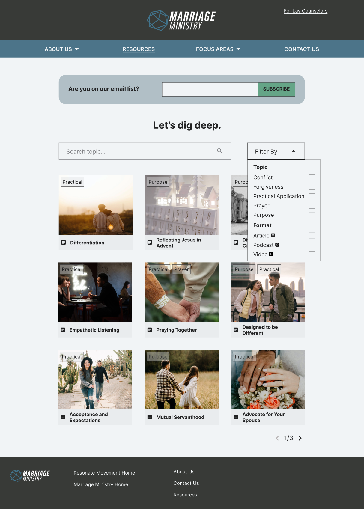 Currently, the marriage ministry has one page and the main site cannot accommodate for the features that the leads desire. Therefore, Resonate proposed for the marriage ministry leads to host their own website.